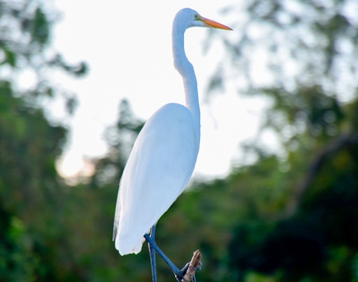 Similar to the snowy egret but larger, the great egret moves with slow precision through shallow sections of the swamp in search of fish.