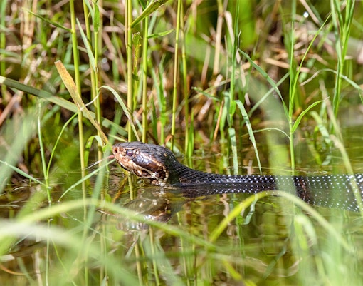 A small, non-venomous snake that prefers brackish marshes. It’s usually tucked among vegetation but occasionally seen resting on floating debris.